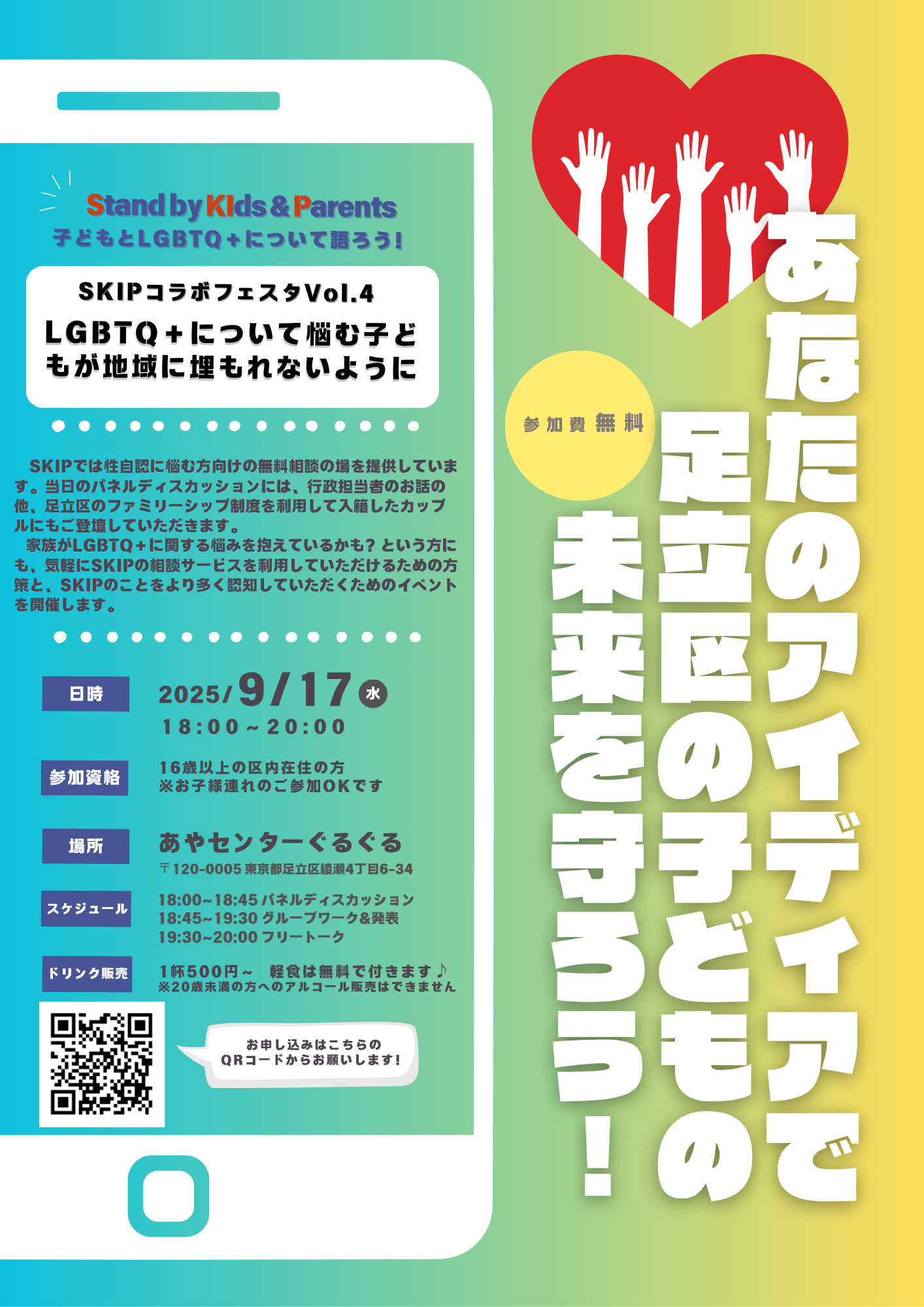 昨年から展開している足立区限定のLINE無料相談サービス「SKIP」の充実に向けた、トークディスカッション&アイディアコンペです。